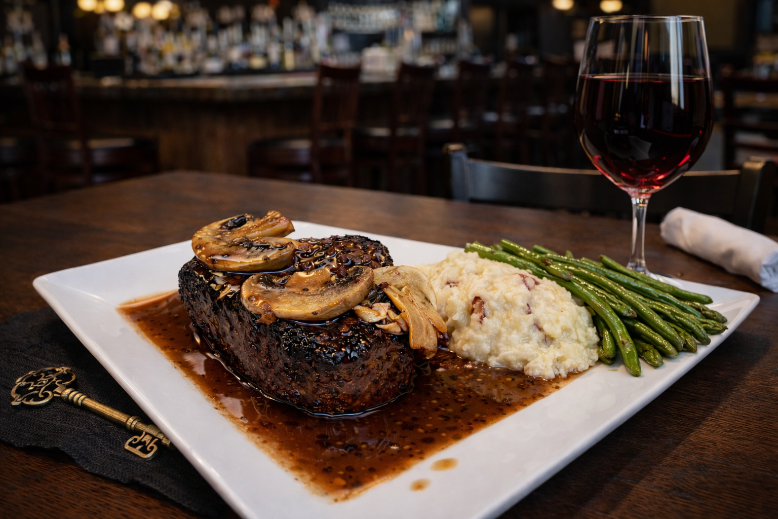 Slow-braised short rib finished with a Luxardo cherry port reduction, served over garlic red skin mashed potatoes and grilled asparagus. Rich. Silky. Unforgettable.